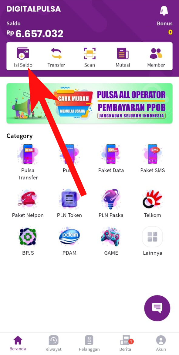 Buka aplikasi. Kemudian pilih menu Isi Saldo.