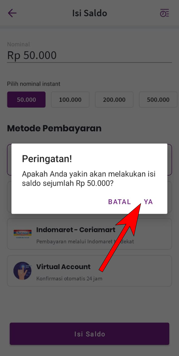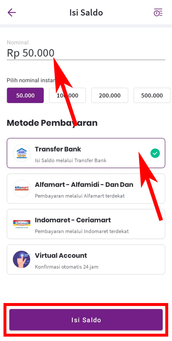 Ketikkan nominal deposit yang diinginkan, dan pilih metode pembayaran. Di sini, contohnya adalah jumlah Rp50.000 dengan metode transfer bank. Kemudian klik tombol Isi Saldo.