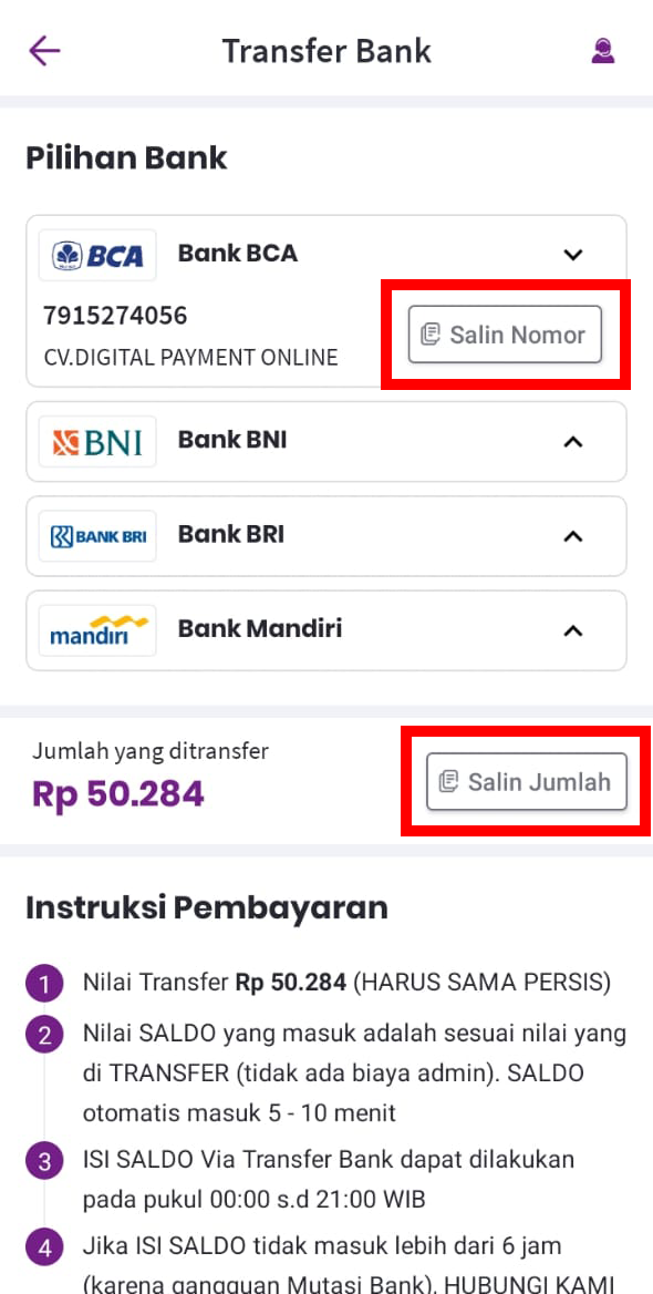 Pada halaman berikutnya, Anda akan diberikan beberapa pilihan rekening bank (untuk metode transfer bank) atau kode pembayaran beserta jumlah uang yang perlu didepositkan. Untuk menghindari kesalahan, Anda bisa salin nomor rekening beserta jumlah uang tersebut.